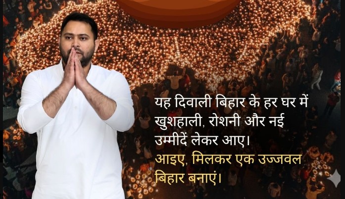 राष्ट्रीय जनता दल (आरजेडी) के नेता और बिहार के मुख्यमंत्री पद के प्रमुख उम्मीदवार तेजस्वी यादव ने दिवाली के अवसर पर अपने समर्थकों और बिहारवासियों को हार्दिक शुभकामनाएँ दी हैं। उन्होंने अपने संदेश में 2025 के विधानसभा चुनावों के बाद बिहार में व्यापक बदलाव और खुशहाली लाने का संकल्प व्यक्त किया। सोशल मीडिया प्लेटफॉर्म एक्स पर साझा किए गए संदेश में तेजस्वी यादव ने कहा कि इस दिवाली के बाद आने वाली हर दिवाली बिहार के लिए सौभाग्य और समृद्धि लेकर आए, और जनता के साथ मिलकर वे बिहार को रोशन करने का काम करेंगे।