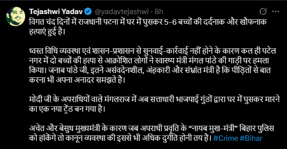 तेजस्वी यादव ने एक्स (पूर्व ट्विटर) पर पोस्ट कर हाल ही में हुई दर्दनाक घटनाओं का जिक्र करते हुए आरोप लगाया कि बीते कुछ दिनों में पटना में पांच से छह मासूम बच्चों की घर में घुसकर निर्मम हत्या की गई है। इन घटनाओं से आम जनता में गुस्सा है लेकिन शासन-प्रशासन पूरी तरह से निष्क्रिय बना हुआ है। उन्होंने विशेष रूप से पटना के पटेल नगर इलाके की घटना को रेखांकित किया, जहां दो मासूमों की हत्या के बाद आक्रोशित भीड़ ने स्वास्थ्य मंत्री मंगल पांडेय की गाड़ी पर हमला कर दिया। तेजस्वी ने कहा कि मंत्री जी इतने असंवेदनशील और घमंडी हैं कि उन्होंने पीड़ित परिवार से बात करने तक की ज़हमत नहीं उठाई।