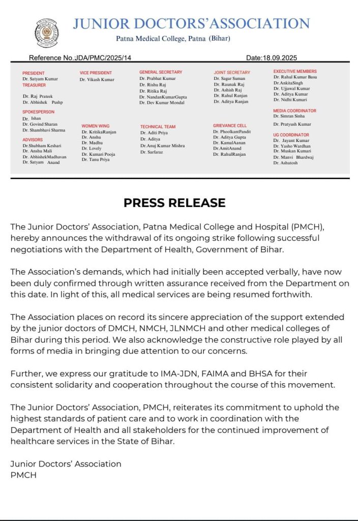 सरकार के साथ करीब 48 घंटे तक चली बैठक में जूनियर डॉक्टरों की चार सूत्रीय मांगों पर सहमति बनी. इसके बाद एसोसिएशन ने तुरंत हड़ताल समाप्त करने का निर्णय लिया. समझौते के बाद पटना मेडिकल कॉलेज अस्पताल (PMCH), दरभंगा मेडिकल कॉलेज अस्पताल (DMCH), नालंदा मेडिकल कॉलेज अस्पताल (NMCH) और जेएलएन मेडिकल कॉलेज (JLNMCH) समेत सभी संबंधित अस्पतालों में जूनियर डॉक्टरों ने मरीजों को सेवा देना शुरू कर दिया है.