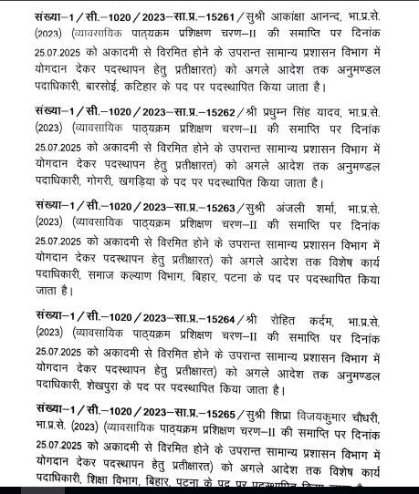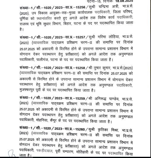 पूर्व में पूर्णिया में उप विकास आयुक्त के पद पर कार्यरत चंद्रिमा अत्री को अब राजस्व एवं भूमि सुधार विभाग में विशेष कार्य पदाधिकारी (OSD) बनाया गया है। वहीं गरिमा लोहिया को पालीगंज अनुमंडल का एसडीओ नियुक्त किया गया है। इन अधिकारियों को 25 जुलाई 2025 को प्रशासनिक प्रशिक्षण अकादमी से कार्यमुक्त किया गया था। उसके बाद सभी अधिकारियों ने सामान्य प्रशासन विभाग में योगदान किया था और पोस्टिंग की प्रतीक्षा में थे।